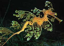 CAMUFLAJE.- El camuflaje puede alcanzar un extraño grado de perfección en algunos miembros, como el Phyllopteryx foliatus australiano, que está dotado de apéndices carnosos en forma de hoja que decoran el cuerpo simulando algas. Llega a medir hasta 30 cm., tamaño verdaderamente grande para un pez de este grupo.Uno de los rasgos más interesantes del caballito de mar, es su facilidad para mimetizarse con su entorno. Este pez ha conseguido ser uno de los campeones del camuflaje, ya que con facilidad adopta desde formaciones que pueden perfectamente pasar por un alga a los ojos de un posible depredador, como colores y texturas muy variadas: amarillos, turquesas, rojos, púrpuras, pardos, con puntos, con rayas, etc. Poseen la misma y extraña habilidad de un camaleón. Son capaces de desarrollar largos filamentos de piel para confundirse entre las algas de su entorno. Esto lo hacen por razones de seguridad y supervivencia.