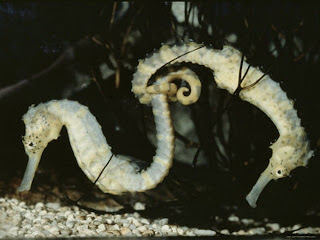 SU COMPORTAMIENTO.- La conducta de los caballitos de mar vivientes es tan interesante como las antiguas leyendas sobre estos animales. Es capaz de ostentar notables cambios de color para acomodarlo al del medio que le rodea.Puede utilizar la cabeza para trepar por entre las algas en las que vive descolgándose de unas a otras.Con frecuencia varios adultos van juntos, trenzando sus colas prensiles con apariencia de que ejecutan una danza, la cual puede ser fatal cuando la ejecutan ejemplares jóvenes, que a veces no saben desprenderse y acaban muriendo de inanición.