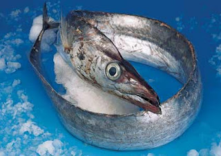 COMO RECONOCERLO.- Tiene el cuerpo muy alargado y comprimido, carece de escamas. Boca muy grande, con las mandíbulas alargadas, la inferior sobrepasa la superior que a su vez tiene unos fuertes dientes, siendo los de la parte anterior en forma de colmillo.La aleta dorsal se extiende a lo largo de todo el cuerpo, está formada por radios por radios espinosos blandos, que a su vez están unidos por una membrana, las aletas pectorales son pequeñas, la caudal es ahorquillada. La coloración es plateada.La piel se le cae con facilidad. En este caso, su aspecto es de color blanco-crema atravesado por una línea lateral oscura.La talla máxima registrada corresponde a 210 cm (8 kg de peso), aunque la tallas de los machos es inferior 176 cm, en capturas comerciales la talla media es de 117 cm, alcanza aproximadamente los 8 años de edad.Se reproduce todo el año, especialmente verano-otoño. Los huevos y larvas son pelágicos.