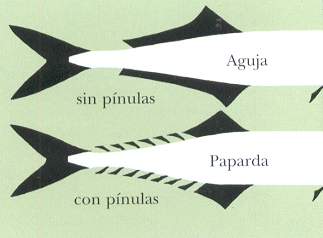 COMO RECONOCERLA.- Cuerpo alargado, comprimido lateralmente. Mandíbulas alargadas y finas, en forma de pico, la superior algo más corta que la inferior. Aletas dorsal y anal seguidas de 5 a 7 pínnulas. Línea lateral muy próxima al perfil ventral. Color azul oscuro por el dorso; flancos plateados. Hasta 45 cm de longitud.Talla: 40 cm.Se reproducen entre octubre y diciembre cerca de la costa.Los huevos son grandes (2 mm.), pelágicos y equipados con unos filamentos rígidos.Los jóvenes son de color azul fuerte y están libres de pico desarrollándose este de diferente forma, primero desarrolla la mandíbula inferior y la superior cuando alcanza unos 15 cm.
