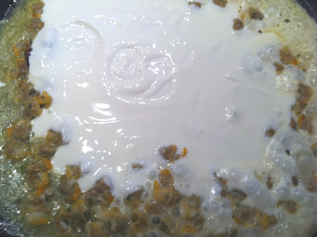Le das unas vueltas, añades la nata y si es preciso un chorro de leche.