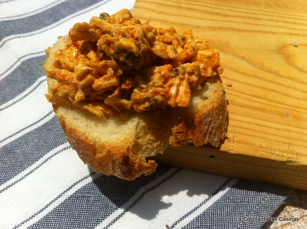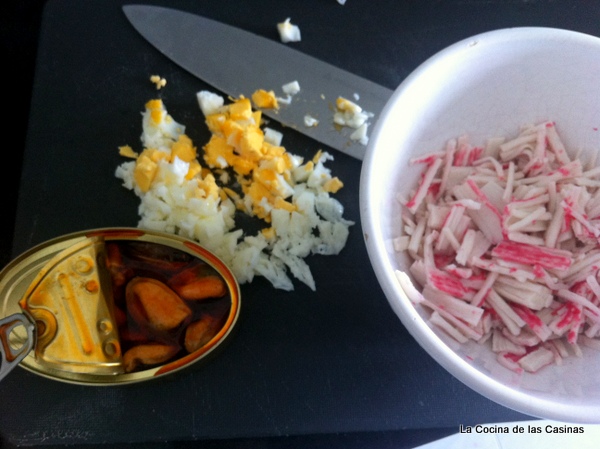 Cortas los palitos en tres partes, desmenuzas con los dedos, parecerá (con bastante imaginación) centollo o chakta. Introduces en un bol junto con los mejillones y su salsa y el huevo cocido muy picado. Mezcla bien.Añade una cucharada de Mayonesa o un poco más y 3 ó 4 gotas de tabasco. Reservas en la nevera. Verás que gusta a todo el mundo.