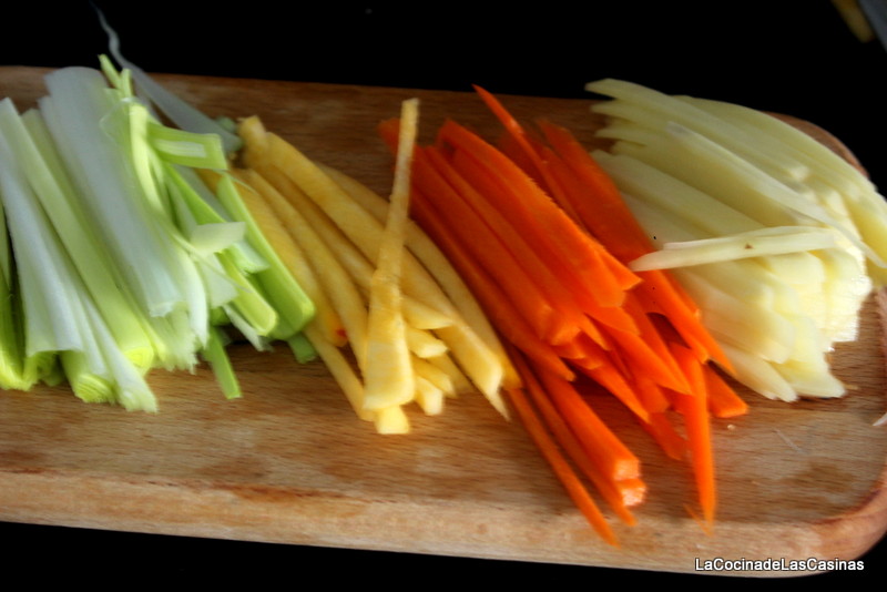 y yo así, las corté en láminas con la mandolina y después en bastoncitos: