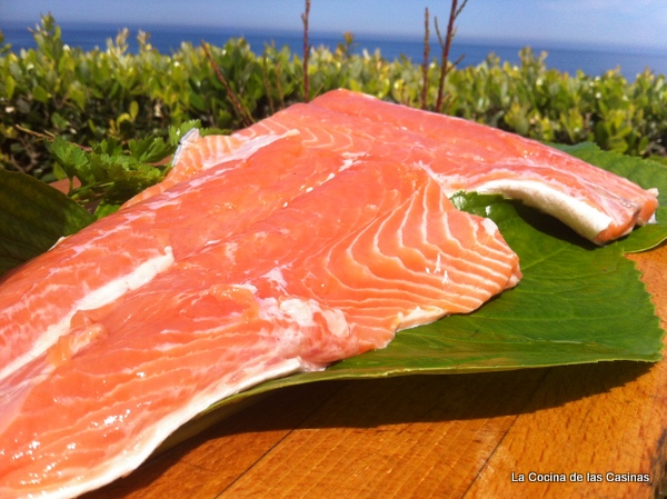 Mis padres fueron unos grandes pescadores de salmón nos encantaba ir de pesca, pero tenía algunos inconvenientes, a partir del primer domingo de marzo en mi casa era imposible comer algo sin salmón, eso sí del Cares, del Sella, del Narcea: al horno, frito, en papillote, croquetas, ensaladilla, fritos......ufffff. Sorprendentemente nunca cocido como me enseñó mi amiga Marga B, otra gran pescadora, su salmón de !!!!9,900 Kg!!! del Deva fue el segundo más grande de la temporada 2007 o del 2008 no me acuerdo, qué bárbara!!!! ella lo hace en una besuguera y entero. Como somos pocos, y este habla noruego, en la pescadería me han preparado un lomo.
